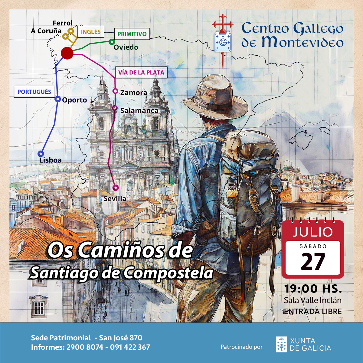 O sábado 27 de xullo, ás 19:00 h, convidase a calquer interesado a celebración "Os camiños de Santiago de Compostela" no Centro Gallego de Montevideo.