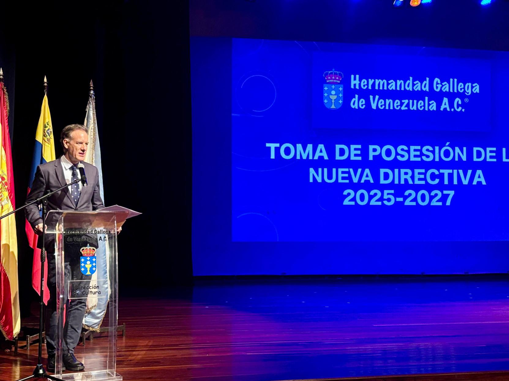 O secretario xeral da Emigración, Antonio Rodríguez Miranda, participou no acto de toma de posesión da nova directiva da Hermandad Gallega de Venezuela, encabezada por Jesús Alberto Bello Couselo, quen asume a presidencia da entidade logo dunha traxectoria destacada dentro da institución. Durante o acto, ao que asistiron máis de 500 persoas, Miranda destacou a importancia da Hermandad como referente da colectividade galega en América Latina e desexou éxitos á nova xunta directiva nesta nova etapa.