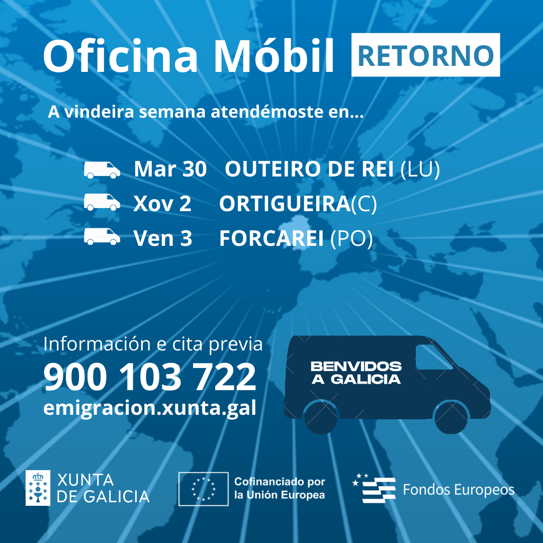 A Oficina Móbil do Retorno da Secretaría Xeral da Emigración visitará a vindeira semana Outeiro de Rei, Ortigueira e Forcarei