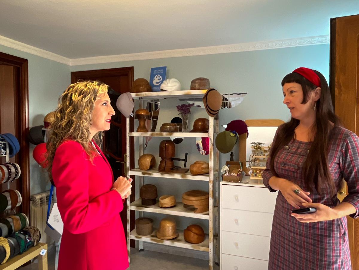 A delegada territorial da Xunta en Ferrol, Martina Aneiros, visitou hoxe en Pontedeume o obradoiro de chapeus e toucados artesanais de Natalia Domíguez, unha galega retornada de Bos Aires (A Arxentina) que foi beneficiada das axudas da Xunta de Galicia para o fomento do autoemprego e a actividade emprendedora das persoas emigrantes retornadas e que lle permitiu iniciar o seu negocio na vila eumesa.