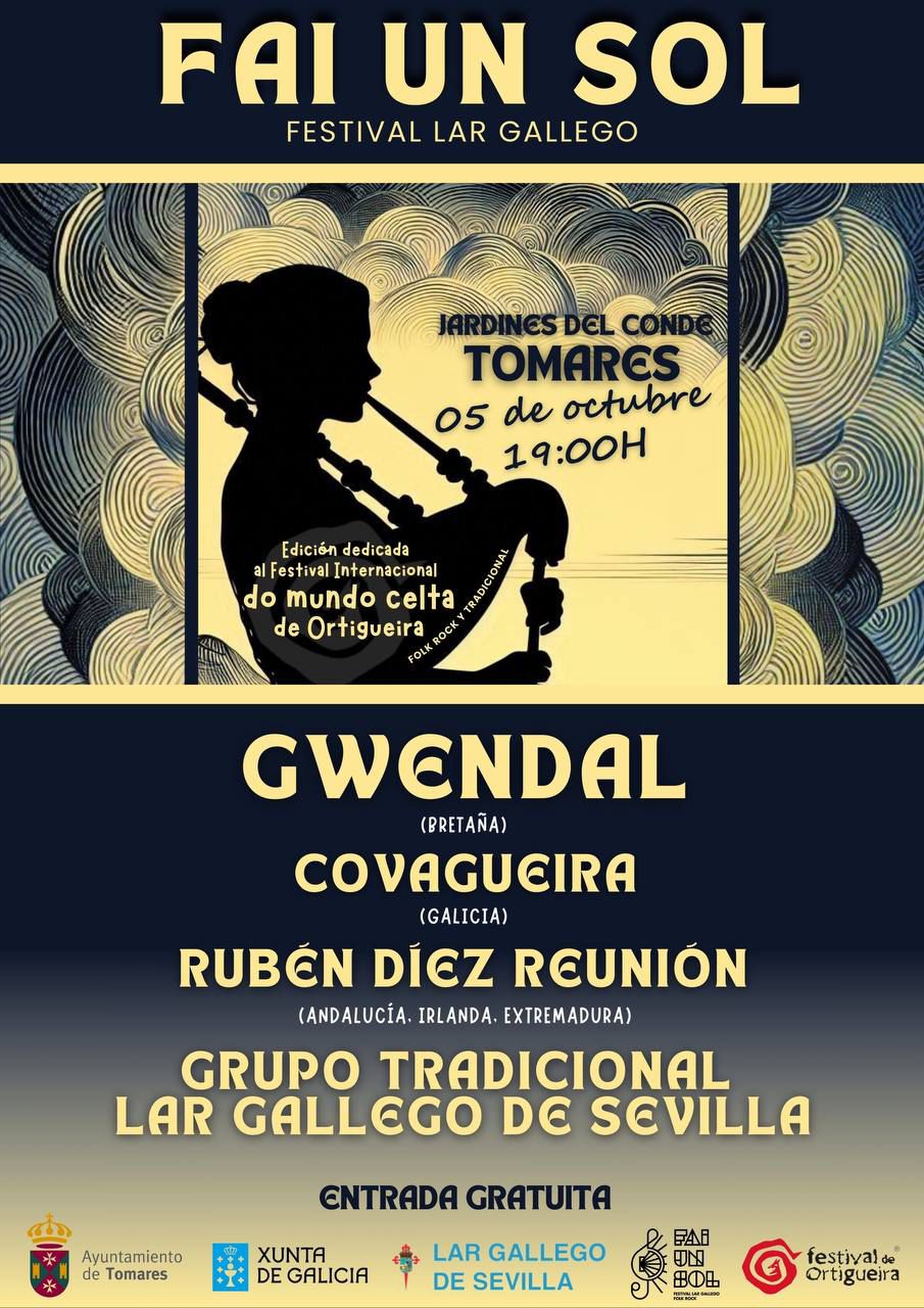 El sábado 5 de octubre a las 19:00 horas abriremos las puertas de los Jardines del Conde (Tomares) a la sexta edición del Festival Fai un Sol dedicada al Festival de Ortigueira (Festival Internacional do Mundo Celta de Ortigueira).