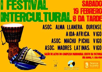 El sábado 19 de febrero a partir de las 20,00 h. en el Salón de Actos del complejo parroquial del Cristo da Victoria de Vigo se celebrará, organizado por el Centro Cultural "Rueiro", el I Festival Intercultural de Vigo, que contará con la participación del Grupo Cultural Alma Llanera de Ourense, y de las asociaciones Aida- Africa, Machu Pichu y Asociación Madres Latinas de Vigo.