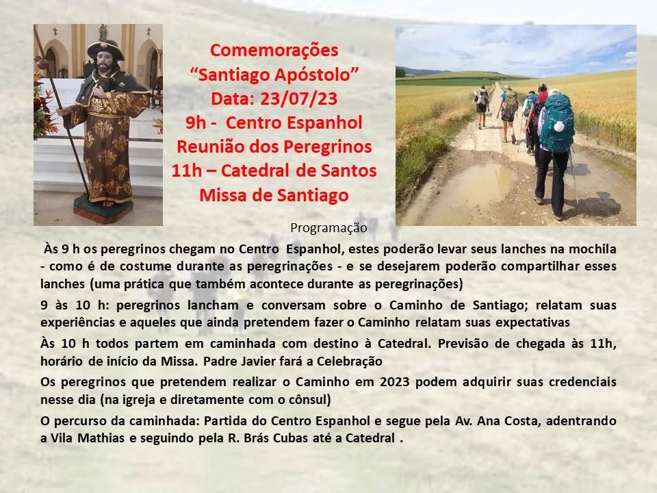 El domingo 23 de julio a partir de las 9:00 h, con salida desde la sede de la entidad gallega en la ciudad santista, el Centro Espanhol e Repatriação de Santos organiza una peregrinación hasta la Catedral de Nuestra Señora del Rosario de Santos, donde se celebrará una misa en honor al Apóstol Santiago.