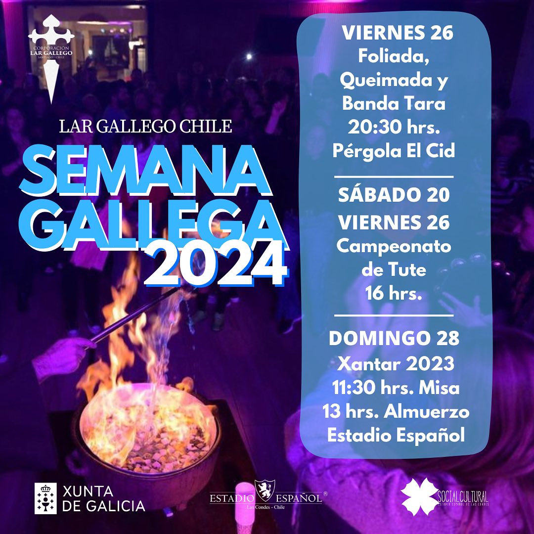 El sábado 20 de julio, el viernes 26 de julio, a las 16:00 h, y el domingo 28 de julio, a las 11:30 h en el Estadio Español de Las Condes, se celebra la Semana Gallega 2024 do Lar Gallego de Chile.