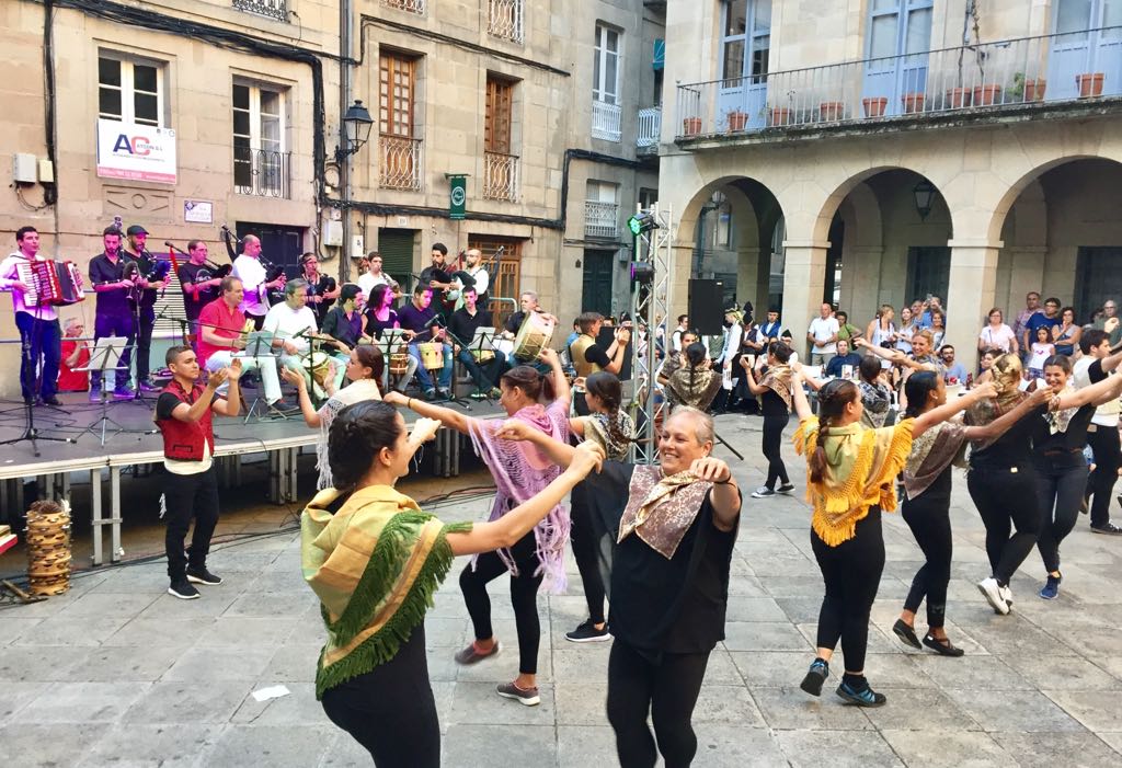 Las 65 personas participantes en la edición de este año en los cursos de gaita tradicional gallega, baile tradicional gallego, percusión tradicional gallega, canto popular y pandereta, y confección de traje tradicional gallego, mostraron su buen hacer en la Plaza de San Martiño, en pleno casco monumental ourensano.