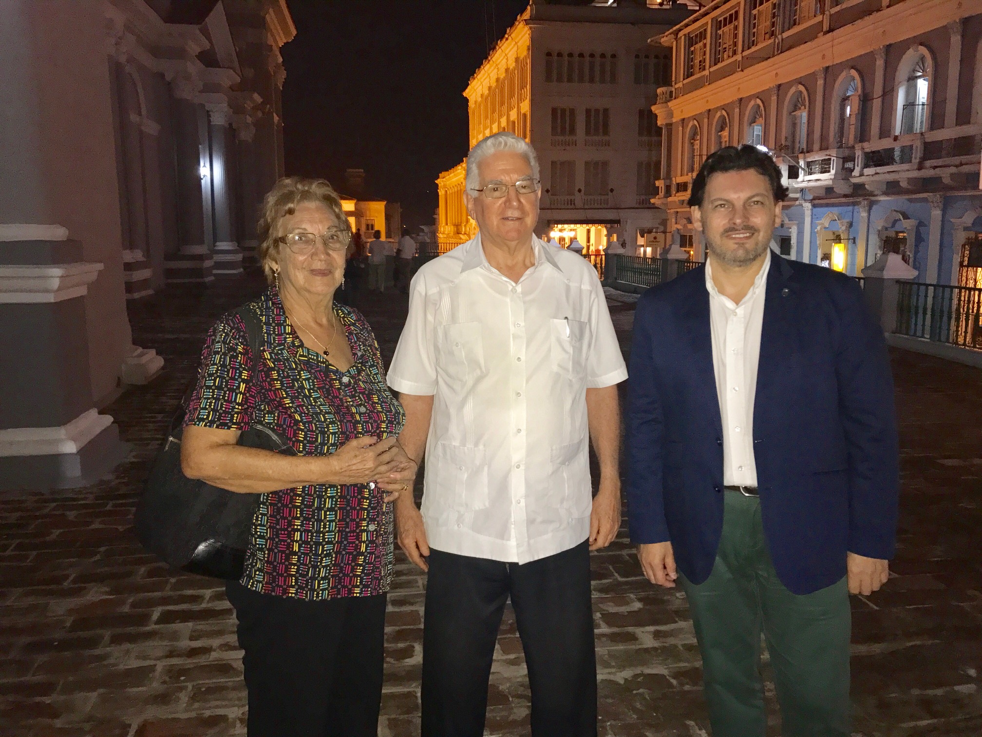 Miranda y Josefina Castro con el arzobispo de Santiago de Cuba y presidente de la Conferencia Episcopal de Cuba, Dionisio Guillermo García Ibáñez, con quien se mantiene un contacto habitual tanto por colaboraciones culturales con la Diócese, homóloga de Compostela, como por el compromiso social y relevancia que tiene en la sociedad cubana