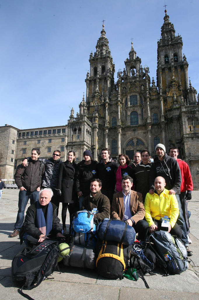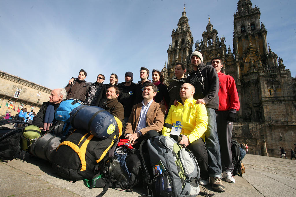 O director xeral de Xuventude, Ovidio Rodeiro, o xerente da Fundación Galicia Emigración, Castelao Bragaña, e mailo subdirector de Programas Sociais da Secretaría Xeral da Emigración, Ramón Brigos, recibiron na Praza do Obradoiro a unha decena de mozos peregrinos de toda Europa asociados en Xuga- Asociación da Xuventude Galega en Europa- tras completar a primeira fase do Camiño desde Tui ata Compostela.